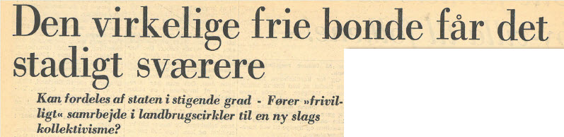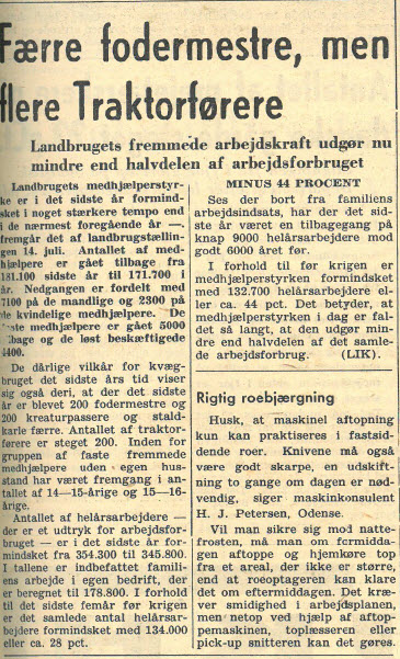 Men statistikkerne fortalte noget helt andet. Efterkrigstidens folkevandringer fra land til by var i fuldt sving. Ved julitællingen var der 181.000 medhjælpere beskæftiget i primærlandbruget – 10.000 færre and året før. Til gengæld var der kommet 8000 nye traktorer til, så nu havde hvert tredje landbrug egen traktor.