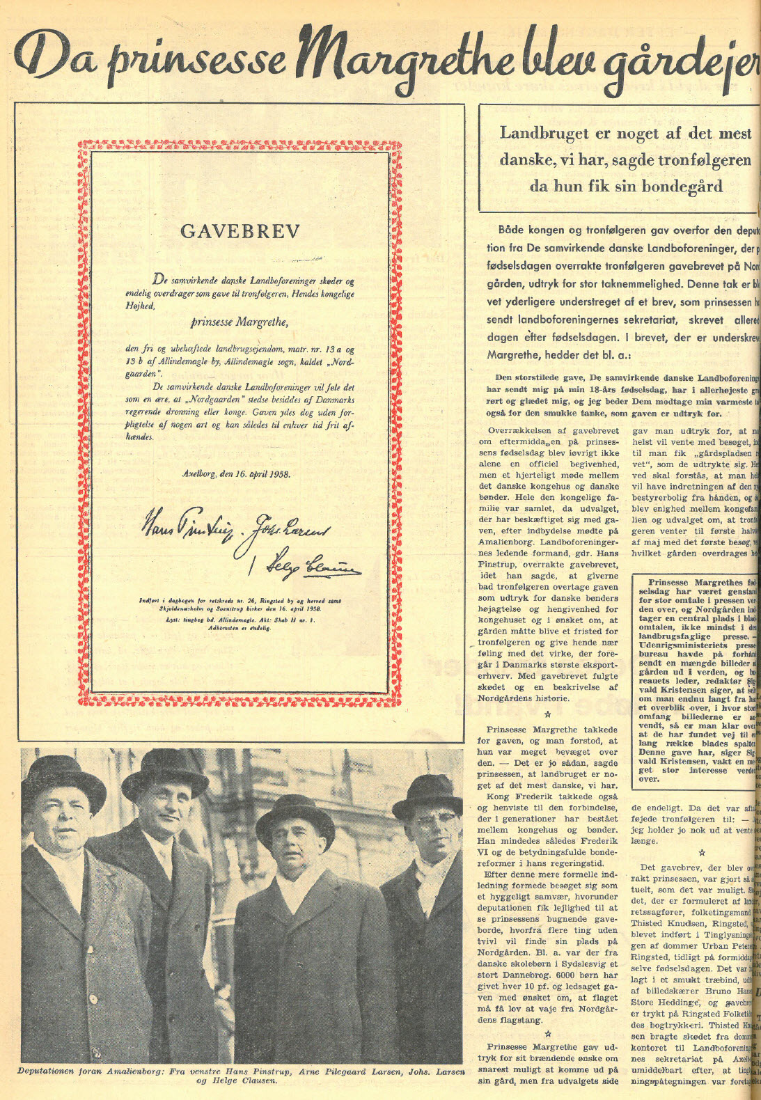 Landmandsrådet 1958 sluttede med et statistisk godt resultat for alle afgrøder set under et. Men det karakteriseres af sin samtid som et ”mærkeligt år”. Høsten viste store forskelle fra egn til egn, mest skuffende på gode jorder. Et lidt sent forår afløstes af kraftige vækstforhold i maj-juni, og både lejesæd og forudsigelser om en rigtig stor kornhøst bredte sig. Men både juni og august gav over 100 mm regn. Kernerne viste sig at være for lette, og kun to tørre uger omkring 1. september gjorde, at man holdt skindet på næsen.