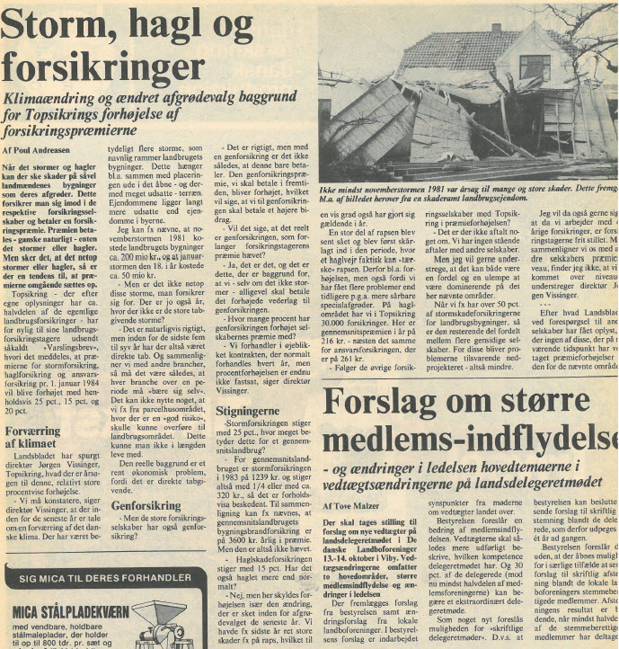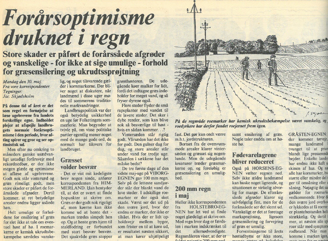 Det er formentlig få landmænd, som har sået og høstet deres jord i 1983, der har glemt det. Både meteorologer og landmænd betegnede det som ”usædvanligt, utroligt, ekstremt”. I de tre forårsmåneder faldt 280 mm nedbør (norm 110), i de tre sommermåneder til gengæld kun 55 mm (norm 200). Mange kunne først så de sidste marker omkring 1. juni. En del af dem skulle hellere have ladet være, for udbyttet dækkede ikke omkostningerne. Med et samlet høstresultat på 125 a.e. var høsten en bundskraber, næsten ligeså dårlig som 1976.