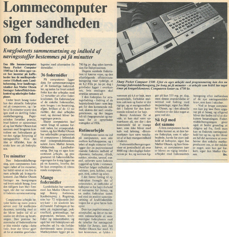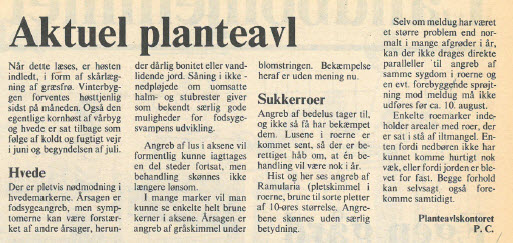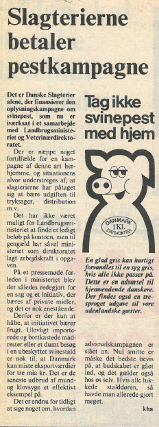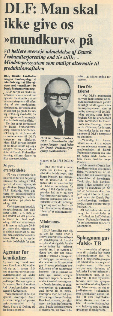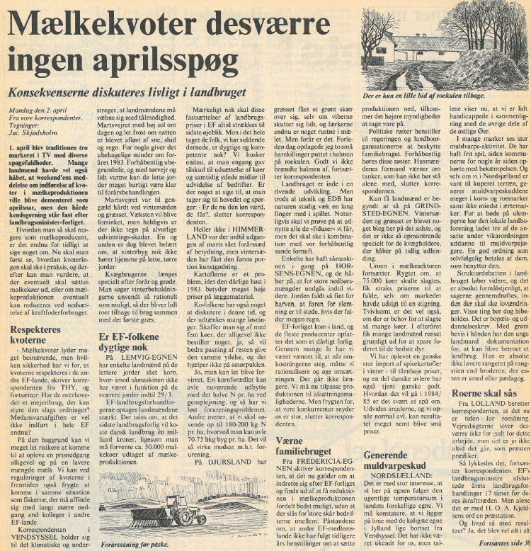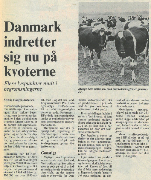 Også husdyrproduktionen var større end nogensinde. Det skete sammen med overskudsproblemer i EF, og efter nogle års tilløb var der ingen vej uden om mælkekvoter fra 1. april. Oven i købet med superafgift på overskridelser. Noget af et kulturskifte for et frit erhverv, men accepteret som ”det mindste onde”. Langt alvorligere trusler mod friheden blev indvarslet med miljøministerens NPO-redegørelse i august.