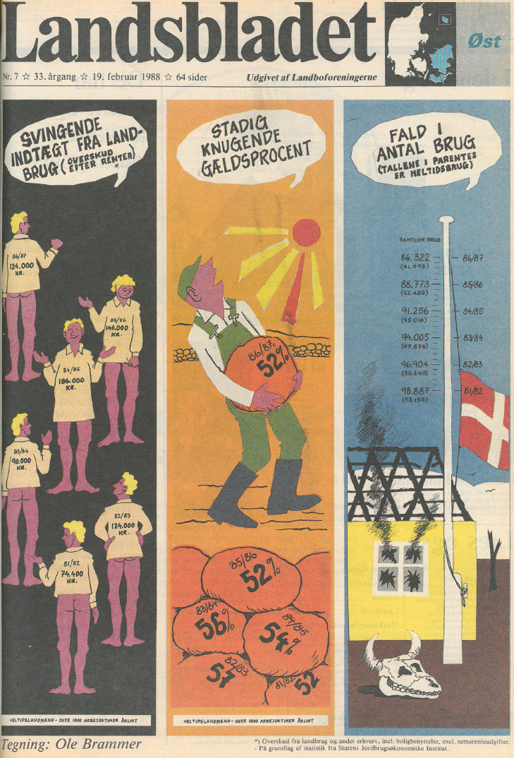 Den ringe 87-høst var en væsentlig faktor bag den elendige indtjening. Desværre faldt den sammen med dårlige salgspriser, ikke mindst fordi EF-kommissionen var tvunget til at iværksætte en hestekur for at bremse overskudsproduktionen. Heldigvis virkede kuren, men her og nu var situationen meget alvorlig. Der måtte stiftes ny gæld med det resultat af, at landmændenes renteudgifter i 1988 beslaglagde ca. 700 procent af bruttooverskuddet fra bedrifternes produktion.