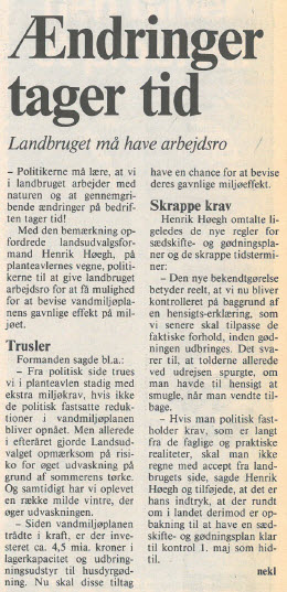 I sådan en situation har trængte folk brug for et klap på skulderen og nogle forstående ord. Landmændene følte, de fik det modsatte: Spot til skade. Enhver påvisning af, at en eller anden tilstand i vandmiljøet ikke fulgte folketingsflertallets vilje, kunne få dem til straks at fare ud med krav om nye indgreb, og faglige forklaringer om, at de ekstremt varme vintre øgede den naturgivne nitratfrigørelse, trængte ikke ind.
