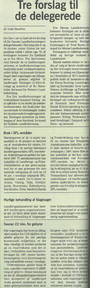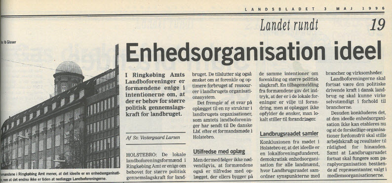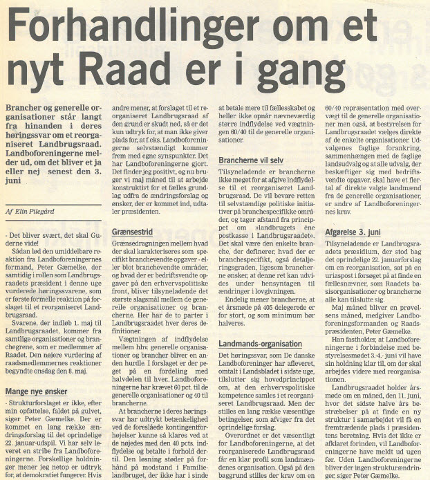 Den voldsomme strukturudvikling på landbrugsbedrifterne fik (endelig) de store landbrugsorganisationer til at gå i forhandlinger om gennemgribende forenklinger i organisationernes hævdvundne arbejdsdeling. Men uden meget held. Efter måneders tovtrækning og diskussioner sluttede processen i juni, da landboforeningernes bestyrelse erkendte, at forslaget ikke kunne samle den fornødne tilslutning i deres egen kreds. Til gengæld fortsatte de samtalerne med Dansk Erhvervsjordbrug (Tovmandsforeningerne) og endte med at aftale en fusion med virkning fra nytår 1997.