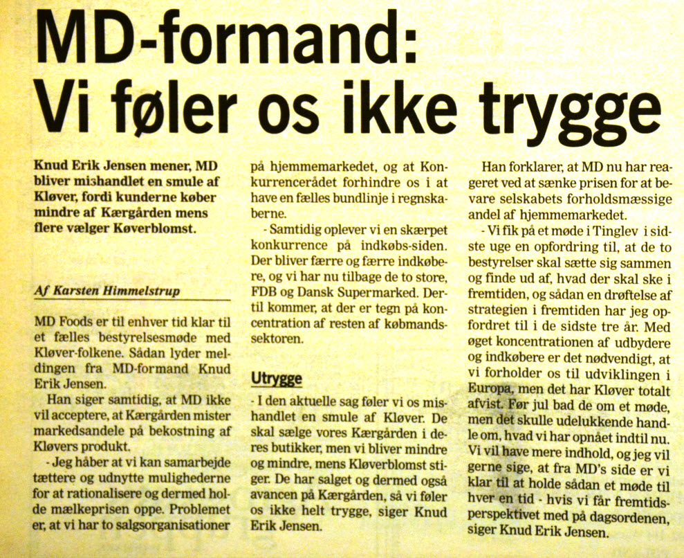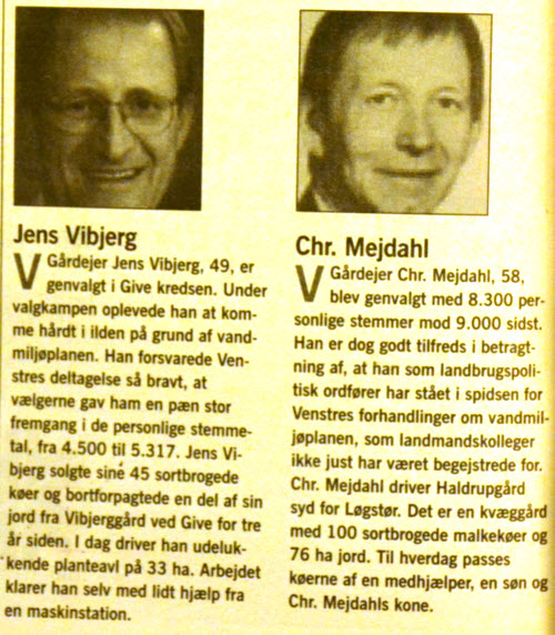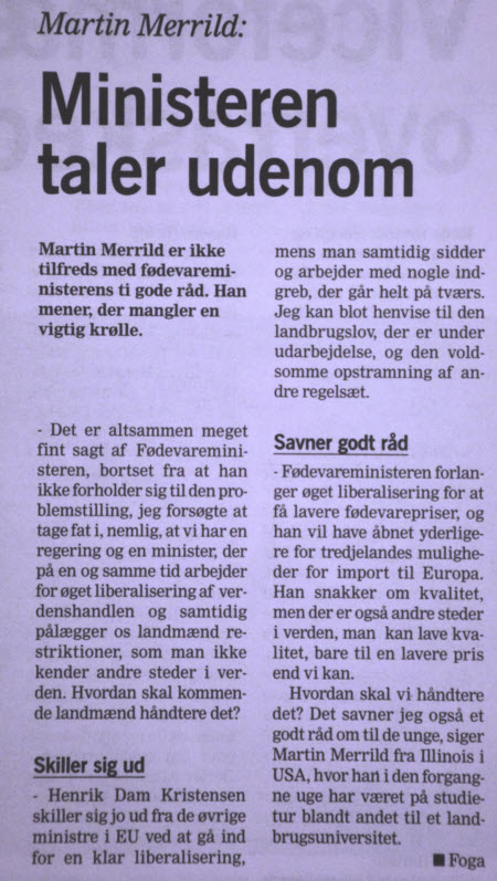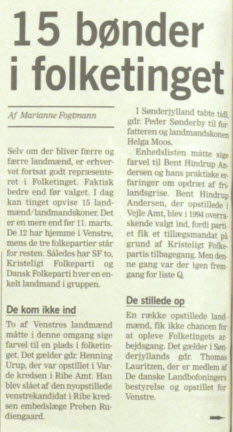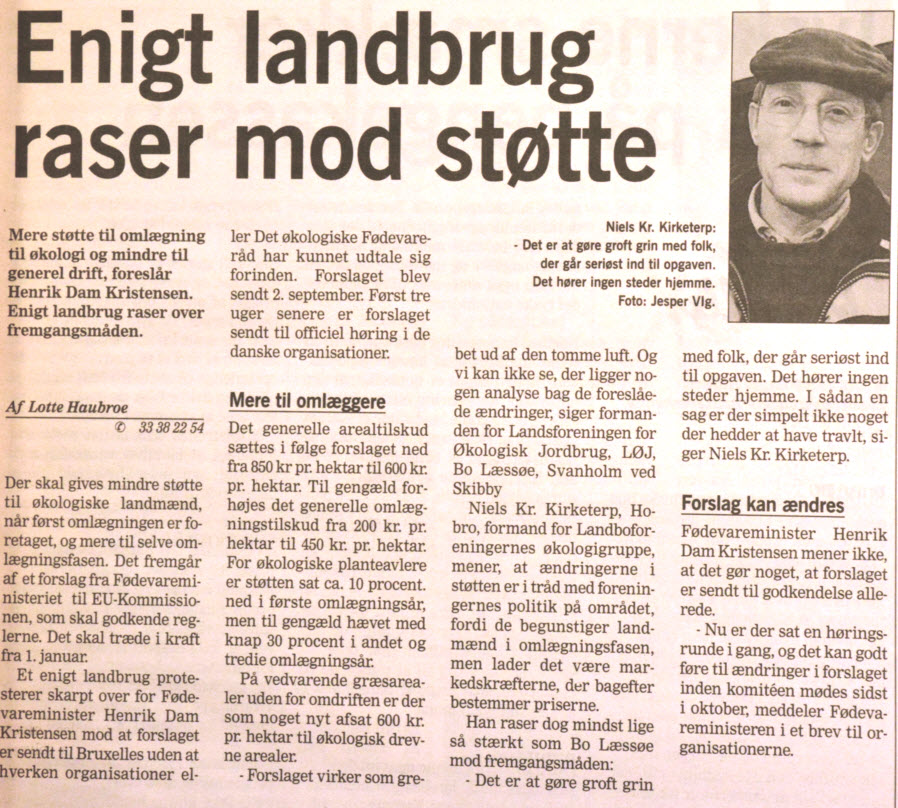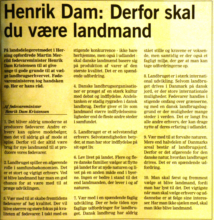 Fødevareministeren forsvarede på landboforeningernes delegeretmøde regeringens politik med bekymringen for, at den hidtidige udvikling i erhvervet ville resultere i ”to gårde i hvert sogn – storbondens gård og kirkegården”. Henrik Dam Kristensen, der var SR-regeringens landbrugs/fødevareminister siden 1994, var fagligt velfunderet og generelt vellidt, men i stigende grad uden politisk gennemslagskraft.