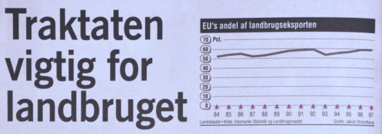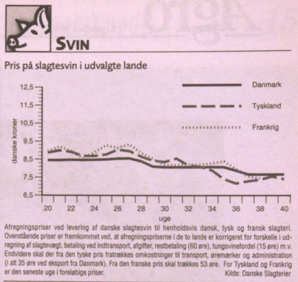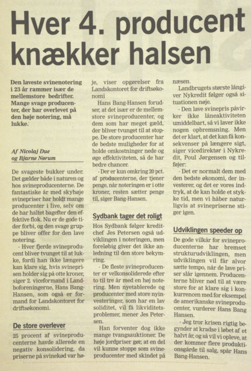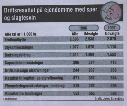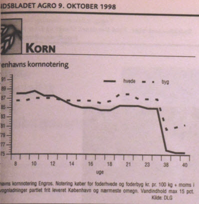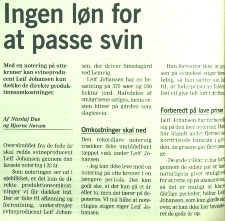Alligevel knækkede fem års stigende indtjeningskurve. De gode svinepriser havde varet ”for længe”- produktionen var steget over alt. Det tvang noteringen ned på syv kr. pr. kg, og efter gennemsnitlige driftsresultater på over en halv mio. kr. i 1997 gik svineproducenterne ud af 1998 med røde tal på bundlinjen. Også planteproduktionen var hårdt ramt. Realprisen på korn var kun ca. en tredjedel af niveauet 20 år tidligere.
