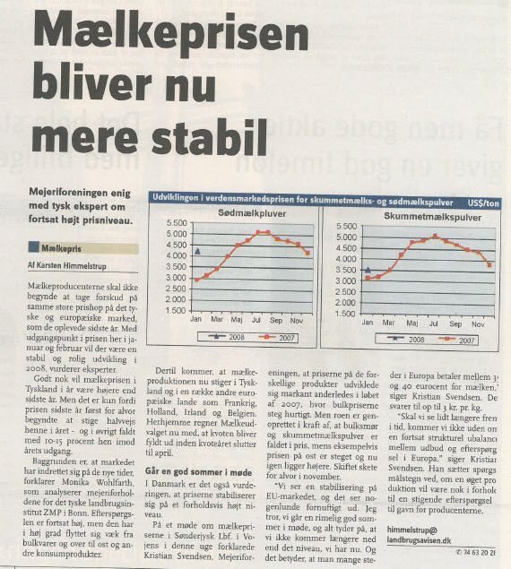 Selv om økononien i resten af samfundet var ved at gå i stå, og en finanskrise truede i horisonten, fortsatte jordprisernes himmelflugt i foråret 2008. Drevet af rekordhøje pris på mælk og helt uhørt gode priser på korn steg jordprisen til 285.000 kr. pr hektar i gennemsnit i første kvartal.