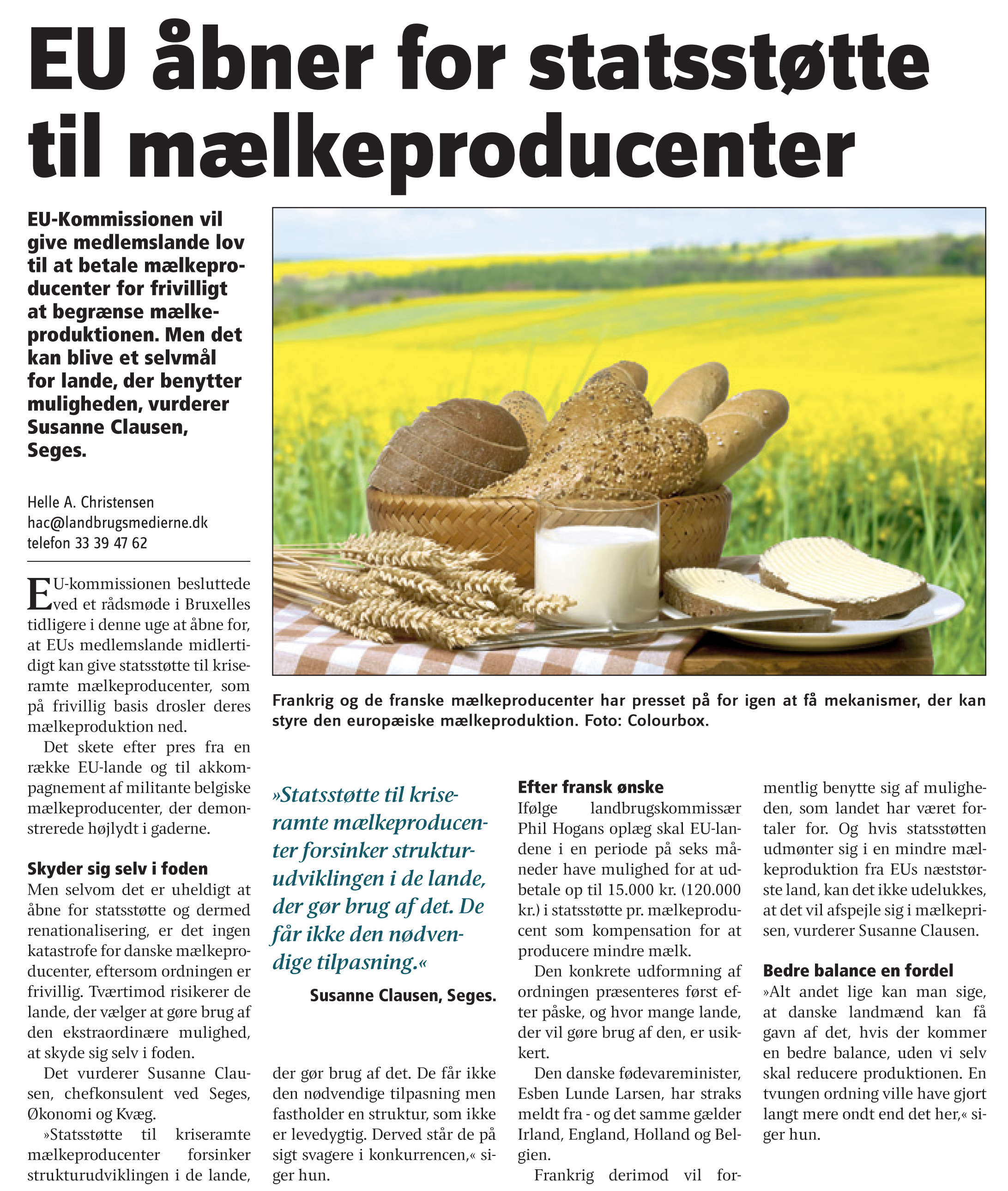 Også mælkeproducenterne kunne ane lysningen. Produktionen faldt, både i og udenfor Europa, og det gav i sensommeren de første små prisstigninger. Hver tiende danske mælkeproducent ville dog ikke være med længere og søgte om støtte til ophør.